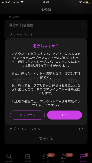 - 確認画面が出るので「OK」を押せば退会が完了する