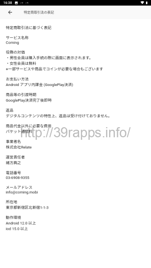 アプリ内「特定商取引法の表記」によれば、「事業者名」は「株式会社Relate」とある。