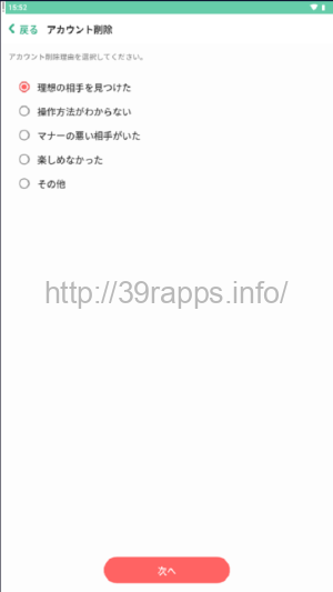 そうすると退会理由を選択する画面に進むので、ここで理由を選択し、「次へ」、そして「削除する」のボタンをタップすると退会申請は完了だ。