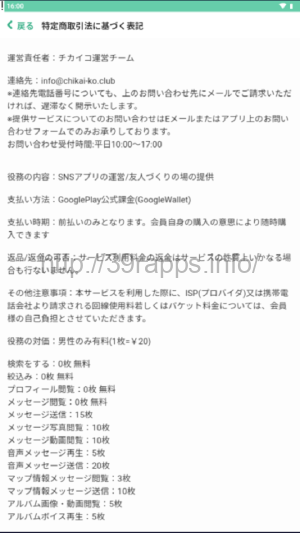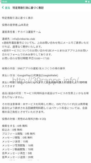 アプリ内「特定商取引法に基づく表記」によれば、「運営責任者」は「チカイコ運営チーム」とあり、役務の提供者は個人名となっている。