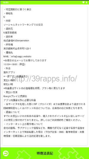 アプリ内「特定商取引に基づく表示」によると、「提供元」には「U運営事務局」とあり、「提供者」には「株式会社KAZcorporation」とある。