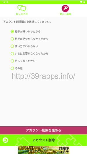 そうするとアカウント削除の理由を選択する画面に移動するので、ここで削除理由を選択して「アカウント削除を進める」のボタンをタップすれば、退会申請は完了だ。