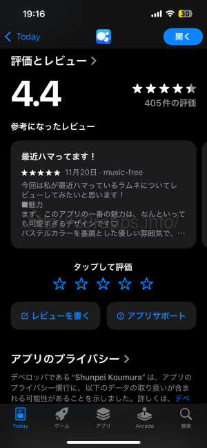 Appstoreの星評価は4.4となかなか高く、405件ほどレビューがあった。