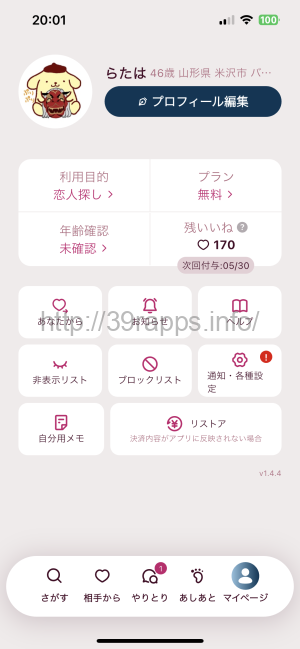 まだ最近リリースされたばかりのアプリであるため、ユーザー数は少なめであるが、30代後半以降の女性しかいないため、中年男性にとっては効率よく使えるアプリかと思う。