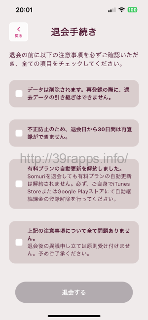- 全ての項目をチェックして「退会する」を押す