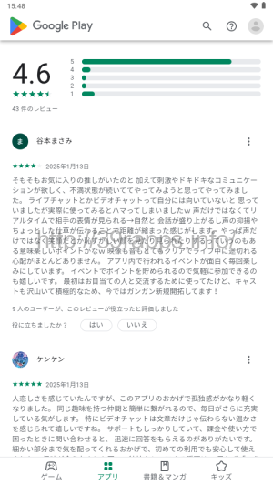 続いてレビューコメントのほうを参照してみると、「自然と会話が盛り上がるしちょっとした仕草が伝わることで距離が縮まった感じがします」「人恋しさを感じていたんですが、このアプリのおかげで孤独感がかなり軽くなりました」など、絶賛のコメントが寄せられている。