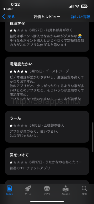 低評価の内容を確認してみると、「普通のエロチャットアプリ」「アプリが見づらい、はなびじゃないし」と書かれている。