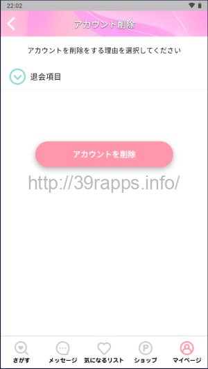 まずアプリ右下にある「マイページ」の項目から「アカウント削除」をタップする。