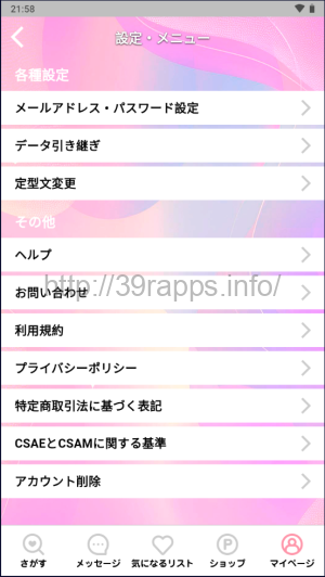 - アプリ右下の「マイページ」から「アカウント削除」