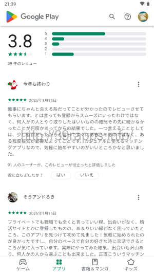 レビュー件数は39件と、この手のアプリにしては非常に少ないな。
