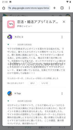 一方で批判的なレビューコメントには、「サクラが詐欺まがいにポイント買わせる仕組み」「ここの運営、裏の顔ヤバいですよ。絶対使わないで」など、サクラや詐欺といった言葉が見えるな。