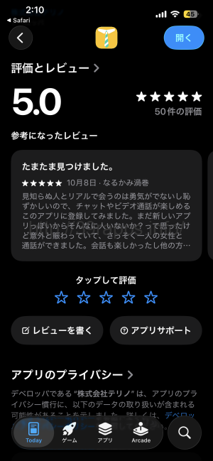 Appstoreの評価は5.0と満点だが、レビューはまだ50件しかない。