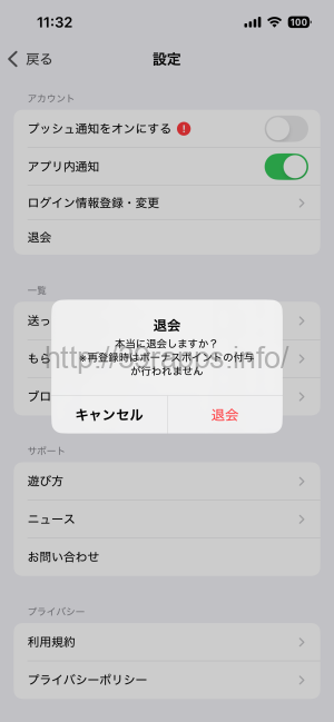 - 確認画面が出るので「退会」を押す