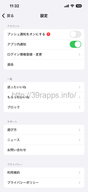 - 設定のページの上から4つ目の「退会」を選択