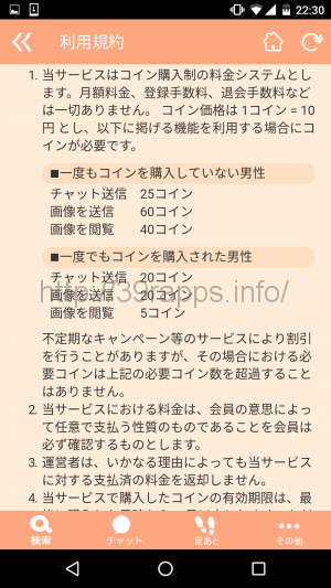 消費されるコインの量は、コイン購入の経験がない場合で25コイン(チャット送信)、60コイン(画像送信)、40コイン(画像閲覧)となっている。