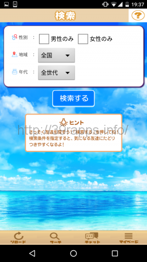 この画面で相手の性別、年代(10代、20代など)、地域による条件の指定を行うことが可能だ。