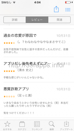 レビュー内容を見てみると、「悪質詐欺アプリ」という題で星1の評価をしている人がいた。