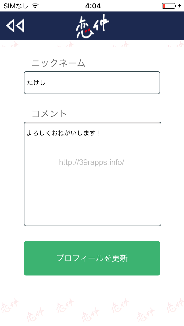 こちらの右側の画像が、プロフィールの登録画面なのだが、ニックネームを書いて、簡単なコメントを入力するだけの超手抜きな作りだ。