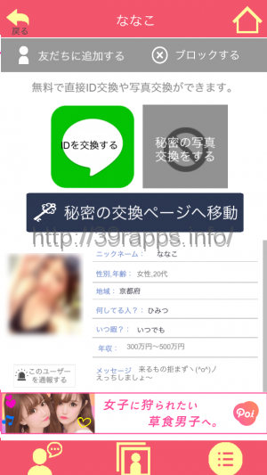 「無料で直接ID交換ができます」「秘密の交換ページへ移動」という風に書かれているが、もちろんこのアプリをダウンロードしたからといって、IDを交換することはできない。