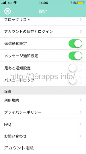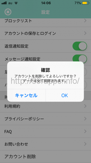 - 「設定」のページの一番下「アカウント削除」をクリック
