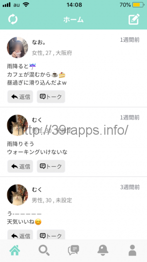 ツイッターのようなつぶやきベースのアプリで、気になった人とはDMでやり取り可能だという。