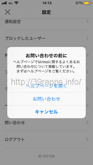 - 「設定」のページの下のほう「問い合わせ」をクリック