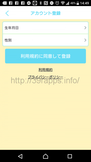 利用規約を読んでから登録するようにと書かれているが、例え利用規約に18才未満の使用禁止と書かれていても、年齢認証がないと問題ありである。
