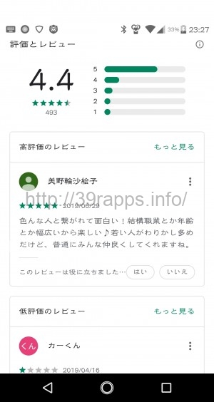 高評価のレビューコメントを見てみると、「色んな人と繋がれて面白い」「普通にみんな仲良くしてくれる」といったコメントが見える。