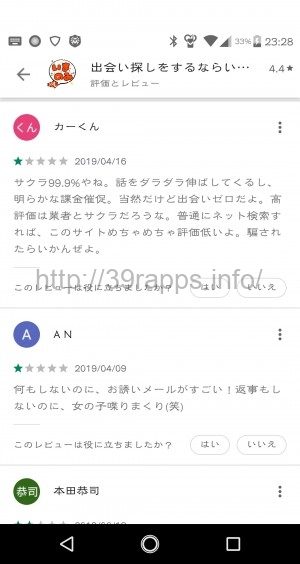 低評価のレビューコメントには、「サクラ99.9%」「明らかな課金最速」「何もしないのに、お誘いメールがすごい」といった、かなり不安になるコメントが見える。