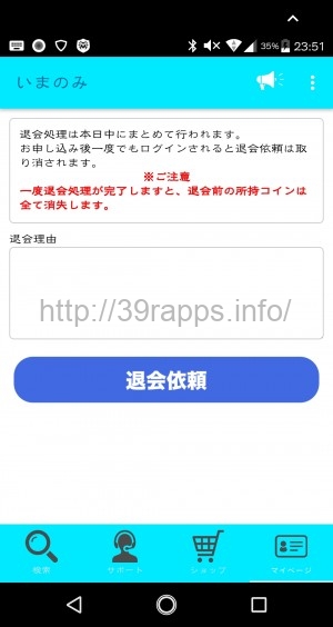 マイページ(プロフィール画面)から、「退会」ボタンを選ぶことで退会することができる。