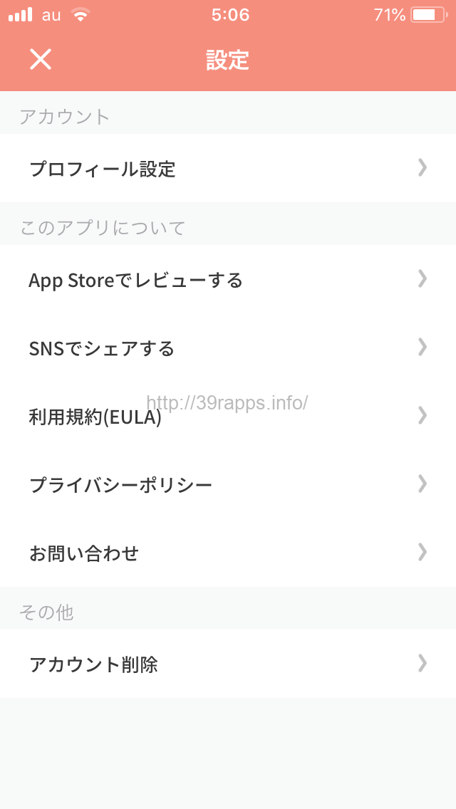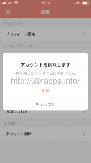 - 設定のページの一番下「アカウント削除」を選択